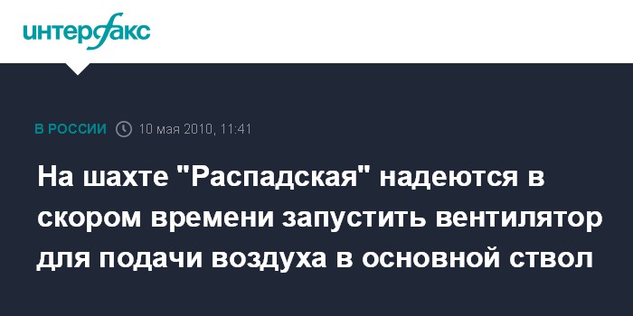Междуреченск. 10 мая. INTERFAX.RU - Вентилятор для подачи воздуха в основной ствол шахты "Распадская" может быть запущен уже во вторник, заявляют в руководстве угольной компании.
