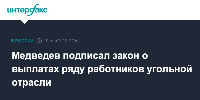 Москва. 10 мая. INTERFAX.RU - Президент России Дмитрий Медведев подписал закон "О дополнительном социальном обеспечении отдельных категорий работников организаций угольной промышленности", сообщила в понедельник пресс-служба главы государства. Закон был принят Госдумой 21 апреля 2010 года и одобрен Советом Федерации 28 апреля 2010 года.