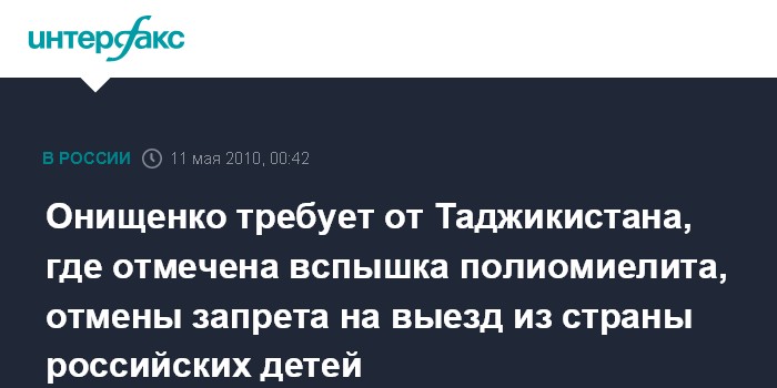 По словам Г.Онищенко, запрет будет действовать до стабилизации ситуации с полиомиелитом или до окончания иммунизации в Таджикистане всех детей в возрасте до шести лет. "На этот шаг мы пошли в связи с тем, что в Ангарске с подозрением на полиомиелит госпитализирована девятимесячная девочка, которая прибыла с мамой из Таджикистана. Девочка госпитализирована, проводятся все необходимые медицинские мероприятия. Для российских детей данный случай угрозы не представляет", - заявил тогда Г.Онищенко.