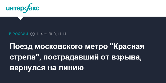 Москва. 11 мая. INTERFAX.RU - Фирменный состав московского метрополитена "Красная стрела", в котором 29 марта был совершен теракт на станции "Лубянка", вновь вышел на линию.