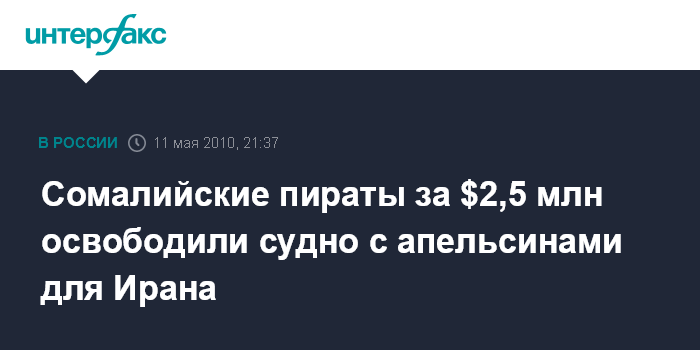 Тегеран. 11 мая. INTERFAX.RU - Сухогруз "МВ Талка", перевозящий 5 тысяч тонн апельсинов из Египта в Иран, освобожден сомалийскими пиратами за выкуп в $2,5 млн, информирует во вторник иранский телеканала "Пресс-ТВ".