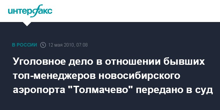 Новосибирск. 12 мая. ИНТЕРФАКС-СИБИРЬ - Западно-Сибирская транспортная прокуратура утвердила обвинительное заключение по уголовному делу в отношении бывшего директора аэропорта "Толмачево" Алексея Чертенкова и его заместителя Алексея Артемьева, обвиняемых в коммерческом подкупе.