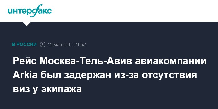 Москва. 12 мая. INTERFAX.RU - Чартерный рейс Москва - Тель-Авив израильской авиакомпании Arkia был задержан 10-11 мая из-за отсутствия российских виз у членов экипажа, говорится в сообщении Росавиации.