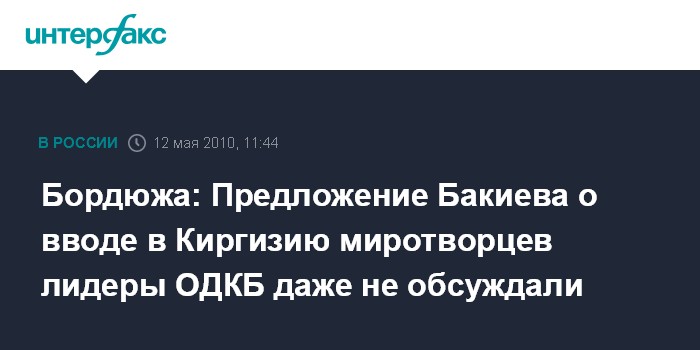 Предложение Бакиева привез на встречу президент Белоруссии Александр Лукашенко. "Могу сказать однозначно: вопрос о задействовании потенциала ОДКБ для разрешения политических проблем Кыргызстана даже не обсуждался. Позиция всех государств, что это внутреннее дело Кыргызстана, это фактически внутриполитическая борьба. И разрешать эту ситуацию они должны сами своими силами, своими действиями, что сегодня и осуществляется временным правительством", - заявил Н.Бордюжа.