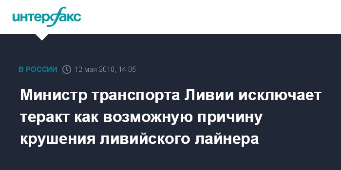 Москва. 12 мая. INTERFAX.RU - Министр транспорта Ливии Мухаммед Зидан на пресс-конференции в среду отверг гипотезу о том, что причиной крушения ливийского лайнера в аэропорту Триполи был теракт. Кроме того, министр подтвердил информацию о том, что в катастрофе выжил один пассажир - восьмилетний голландец.