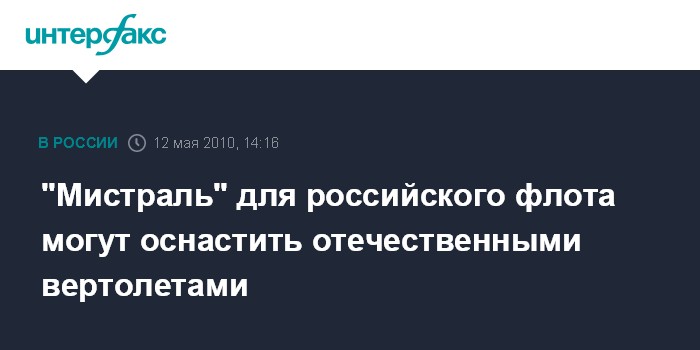 Москва. 12 мая. INTERFAX.RU - Вертолетоносец "Мистраль", который планируется закупить во Франции для ВМФ России, может быть оснащен вертолетами российского производства, заявил исполнительный директор холдинга "Вертолеты России" Андрей Шибитов. "Было очень приятно услышать от наших французских коллег, командира первого "Мистраля", на который мы садились, когда апробировали посадку, взаимодействие вертолета и корабля, что Ка-52 просто создан для ударных операций с этого авианосца, он настолько вписался по всем параметрам в инфраструктуру корабля, в его назначение", - сказал Шибитов в среду на пресс-конференции в центральном офисе "Интерфакса".