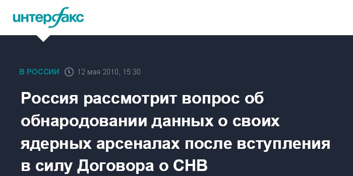 Москва.12 мая. INTERFAX.RU - В Москве заявляют, что рассмотрят вопрос о предании гласности суммы имеющихся у России ядерных носителей и боезарядов после вступления в силу нового российско-американского Договора о СНВ. "После вступления в силу Договора стратегических наступательных вооружений, подписанного в Праге 8 апреля президентами РФ и США, мы также сможем рассмотреть в практической плоскости вопрос о придании гласности суммы имеющихся у России развернутых стратегических носителей и защитываемых за ними боезарядов", - сказал официальный представитель МИД РФ Андрей Нестеренко в среду на брифинге в Москве.