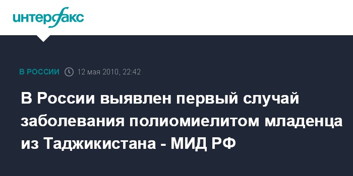 Москва. 12 мая. ИНТЕРФАКС - В России зарегистрирован первый случай заболевания полиомиелитом у девятимесячного ребенка, являющегося таджикским гражданином и прибывшего 1 мая 2010 года с родителями из Таджикистана в Иркутскую область, сообщил официальный представитель МИД РФ Андрей Нестеренко журналистам.