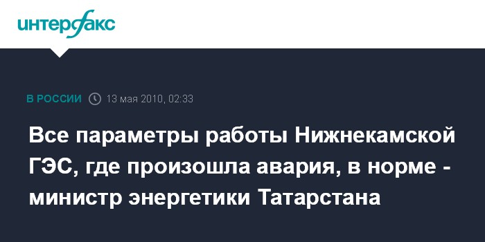 "За 30 лет существования Нижнекамской ГЭС таких случаев не было. Мы еще посмотрим, все обследуем, и дадим оценку данному случаю. Создана специальная комиссия, ее члены в сроки, отведенные при таких происшествиях, изучат материалы и огласят итоги и причины произошедшего", - отметил И.Фардиев.