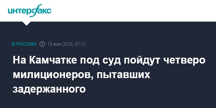 Петропавловск-Камчатский. 13 мая. ИНТЕРФАКС-ДАЛЬНИЙ ВОСТОК-В Петропавловске-Камчатском будут судить четверых милиционеров, которые 17 часов пытали задержанного, выбивая у него признание в преступлении.