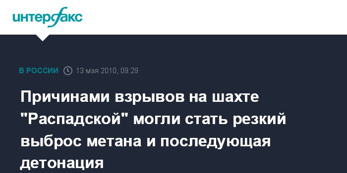 Москва. 13 мая. INTERFAX.RU - Первый взрыв на шахте "Распадская" мог произойти из-за резкого выброса метана, второй - в результате детонирования образовавшейся смеси из газа, пыли и кислорода, считает директор Института угля и углехимии Сибирского отделения Российской Академии Наук Вадим Потапов.