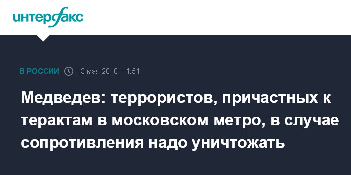 Медведев: террористов, причастных к терактам в московском метро, в случае сопротивления надо уничтожать