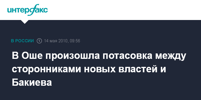 Москва. 14 мая. INTERFAX.RU - В южной столице Киргизии Оше в пятницу произошла потасовка между сторонниками двух губернаторов, представляющих временное правительство и экс-президента Курманбека Бакиева.