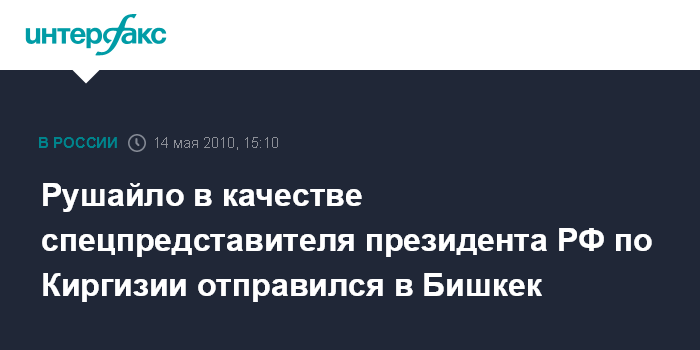 Москва. 14 мая. INTERFAX.RU - Спецпредставитель президента по развитию отношений с Киргизией Владимир Рушайло в пятницу утром вылетел в Бишкек, сообщил "Интерфаксу" источник в Кремле. "В 11 утра планировался вылет В.Рушайло с небольшой группой помощников в Киргизию", - сказал он. По словам представителя Кремля, одна из основных задач Рушайло - способствовать нормализации ситуации в этой ценральноазиатской стране.
