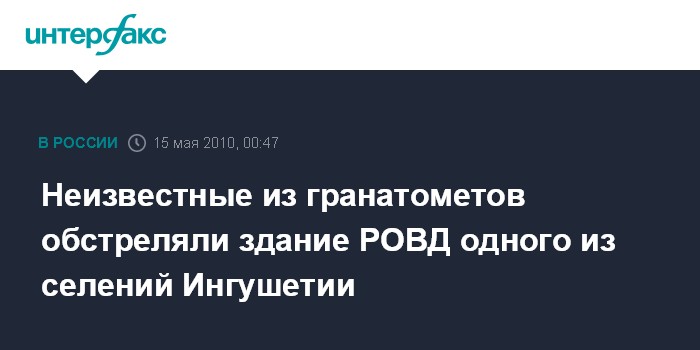 Назрань. 15 мая. ИНТЕРФАКС-ЮГ - В селении Экажево Назрановского района Ингушетии около полуночи в пятницу неизвестные лица из подствольных гранатометов совершили обстрел здания Назрановского РОВД.