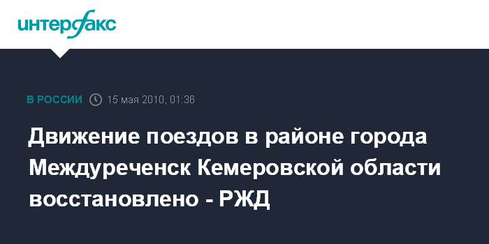 Москва. 15 мая. ИНТЕРФАКС - Возобновлено движение поездов в Кемеровской области, прерванное из-за забастовки жителей Междуреченска, сообщили в субботу агентству "Интерфакс" в пресс-службе ОАО "РЖД".