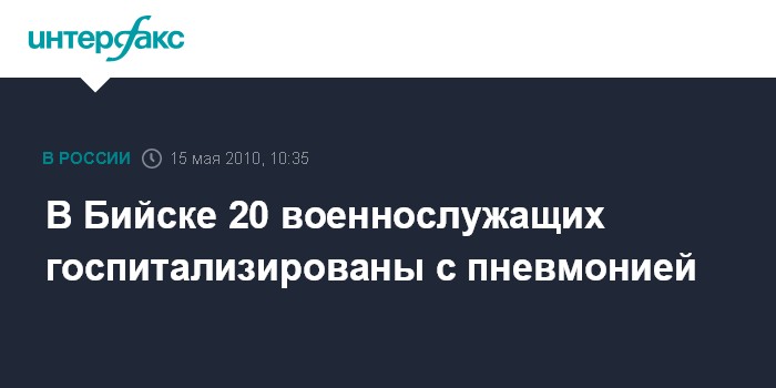 Москва. 15 мая. INTERFAX.RU - В центральную городскую больницу Бийска Алтайского края госпитализированы с пневмонией 20 военнослужащих одной из воинских частей.