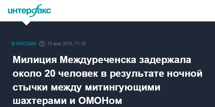 Москва. 15 мая. INTERFAX.RU - В Междуреченске милиция задержала около 20 человек в результате столкновения местного ОМОНа и митингующих шахтеров, перекрывших в ночь на 15 мая железнодорожные пути.