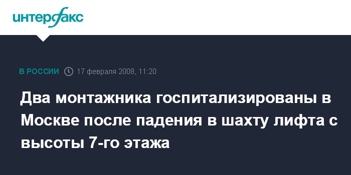 Москва. 17 февраля. INTERFAX.RU - В Москве в результате несчастного случая два человека упали в шахту лифта.