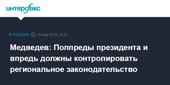 Москва. 15 мая. INTERFAX.RU – Задача установления законодательного единства на всей территории России успешно выполнена при помощи полпредов президента в федеральных округах, но они не должны ослаблять контроля за этой сферой, заявил президент РФ Дмитрий Медведев.