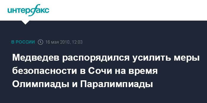 Москва. 16 мая. INTERFAX.RU - Президент России Дмитрий Медведев подписал указ "Об обеспечении безопасности при проведении XXII Олимпийских зимних игр и XI Паралимпийских зимних игр 2014 года в г.Сочи", сообщила в воскресенье пресс-служба Кремля. "Ввести усиленные меры безопасности при проведении XXII Олимпийских зимних игр и XI Паралимпийских зимних игр 2014 года в г.Сочи с 7 января по 16 апреля 2014 г", - говорится в частности в документе.