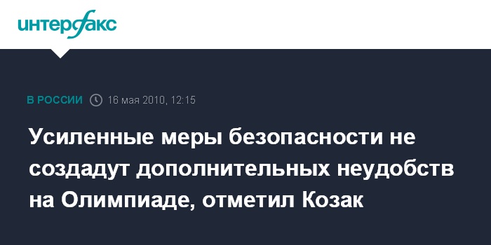 "Поскольку в современном мире угрозы безопасности при проведении массовых мероприятий независимо от страны проведения принципиально не отличаются, в Сочи не планируется никаких экстраординарных мер, которые создадут дополнительные неудобства участникам и гостям Олимпиады", - отметил в связи с этим Д.Козак.