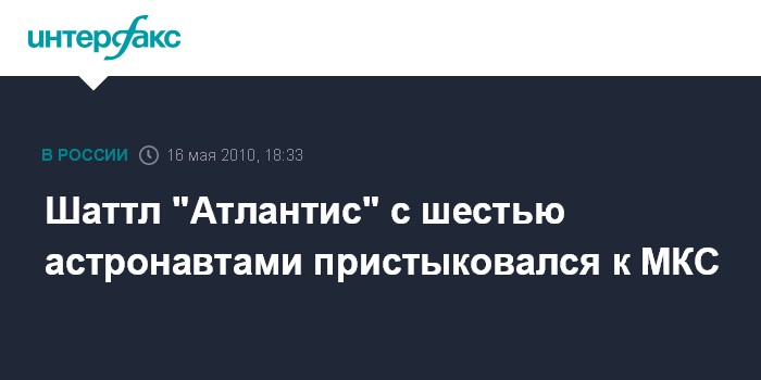 Вашингтон. 16 мая. INTERFAX.RU - Американский пилотируемый космический корабль "Атлантис" с российским малым исследовательским модулем "Рассвет" на борту причалил к Международной космической станцией (МКС), сообщает Национальное аэрокосмическое агентство США. "Шаттл "Атлантис" пристыковался к гермоадаптеру PMA-2 американского сегмента МКС. После проверки герметичности открытие переходных люков между кораблем и станцией состоится в 12:30 по восточному американскому времени (20:30 МСК - ИФ-АВН)", - говорится на сайте НАСА.