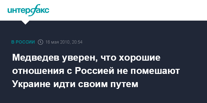 Москва. 16 мая. ИНТЕРФАКС - Развитие полноценных отношений с Россией не создаст препятствий Украине, если она захочет идти по пути европейской интеграции, заявляет президент России Дмитрий Медведев.
