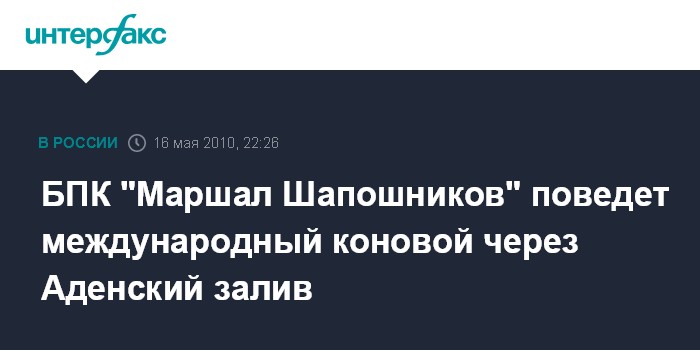 Джибути. 16 мая. ИНТЕРФАКС - Большой противолодочный корабль (БПК) "Маршал Шапошников" Тихоокеанского флота России, прибывший в воскресенье в Джибути после успешного выполнения операции по освобождению танкера "Московский университет" от пиратов, 18 мая начнет проводку международного конвоя через Аденский залив в восточном направлении.