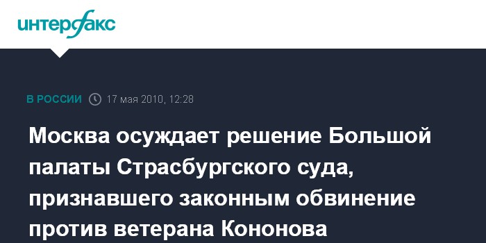 Москва. 17 мая. INTERFAX.RU - Российская сторона осудила решение Большой палаты Европейского суда по правам человека (ЕСПЧ), признавшей в понедельник законным обвинение в военных преступлениях ветерана войны Василия Кононова. Как заявили в понедельник "Интерфаксу" в Департаменте информации и печати МИД РФ, "это решение непонятно: мы только что отметили 65-летнюю годовщину Победы во Второй мировой войне, и вдруг принимаются подобные решения против тех, кто боролся с фашизмом".