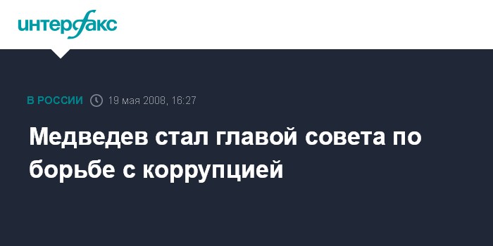 Москва. 19 мая. INTERFAX.RU – В России создан совет по борьбе с коррупцией, который возглавил президент Дмитрий Медведев. Об этом сообщил глава администрации президента Сергей Нарышкин.