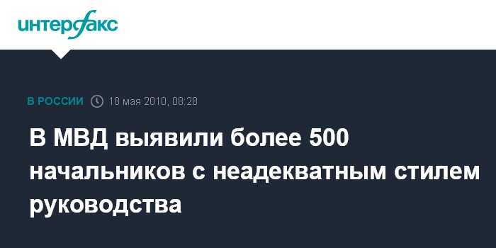Москва. 18 мая. INTERFAX.RU - Стиль руководства более 520 милицейских начальников не соответствует требованиям, которые предъявляет МВД РФ к своим сотрудникам, причем число таких руководителей за последний год возросло почти в полтора раза.
