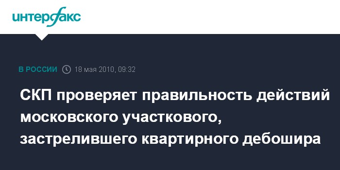 Москва. 18 мая. INTERFAX.RU - Следственный отдел СКП РФ по району Бутырский проводит доследственную проверку правомерности применения оружия участковым ОВД "Алтуфьевский", в результате чего скончался квартирный дебошир, сообщил официальный представитель столичного управления СКП РФ Сергей Марченко.