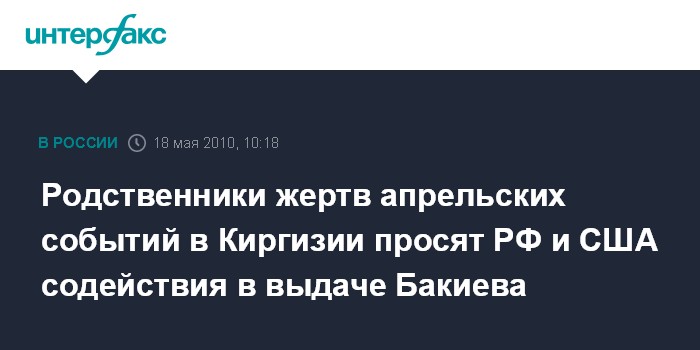Как сообщил журналистам председатель общественного объединения "Мекен шейиттери" Арстанбек Сагындыков, на имя президентов России, США, Казахстана и Белоруссии от имени родителей погибших будет передано соответствующее обращение. "На основании международных конвенций экс-президент Бакиев должен быть экстрадирован в Киргизию. Родственники погибших в апрельских событиях настаивают на проведении судебного процесса над К.Бакиевым", - сказал Сагындыков.