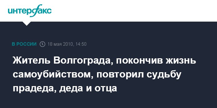 Со слов матери, самоубийством закончили жизнь его прадед, дед и отец. Последний повесился три года назад, сообщили во вторник агентству "Интерфакс" в следственном отделе Кировского района Волгограда СУ СКП по Волгоградской области.