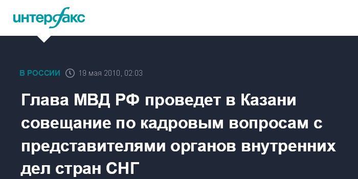 Казань. 19 мая. ИНТЕРФАКС-ПОВОЛЖЬЕ - Совещание руководителей кадровых аппаратов министерств внутренних дел стран СНГ пройдет 19-20 мая в Казани (Татарстан).