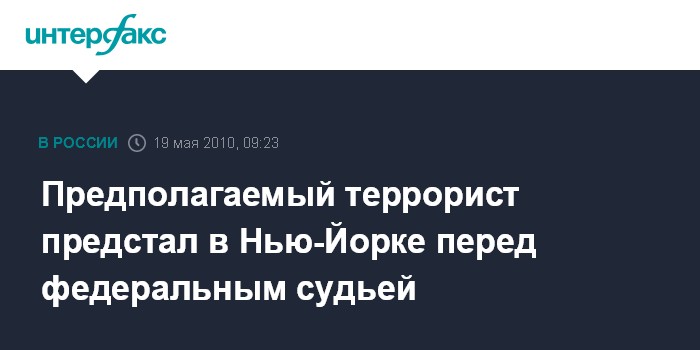 Москва. 19 мая. INTERFAX.RU - Американец пакистанского происхождения Фейсал Шахзад, обвиняемый в попытке провести теракт в центре Нью-Йорка, в среду впервые предстал перед федеральным судьей, сообщают местные СМИ. В суде Шахзад не сообщил, признает ли он себя виновным. Судья Джеймс Фрэнсис объявил, что предполагаемый террорист остается под стражей, а следующее заседание по этому делу состоится 1 июня.