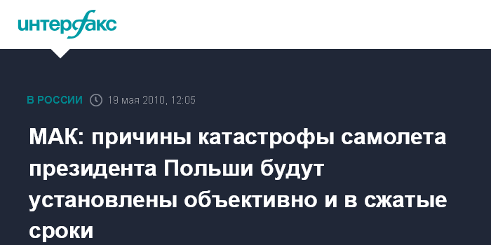 Москва. 19 мая. INTERFAX.RU - Все обстоятельства и причины катастрофы самолета президента Польши Леха Качиньского, разбившегося под Смоленском, будут установлены объективно в условиях открытости. "Уверенно заявляю, что все обстоятельства и причины катастрофы будут установлены объективно и открыто", - заявила на пресс-конференции в центральном офисе "Интерфакса" в среду председатель Межгосударстванного авиационного комитета (МАК) Татьяна Анодина.