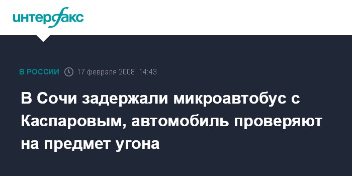 Сочи/Москва/Ростов-на-Дону. 17 февраля. INTERFAX.RU - Лидер Объединенного гражданского фронта Гарри Каспаров заявляет, что в воскресенье в Сочи был задержан микроавтобус, в котором он ехал со своими соратниками.