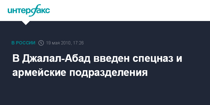 Москва. 19 мая. INTERFAX.RU - В город Джалал-Абад на юге Киргизии введены внутренние войска, милицейский спецназ и армейские подразделения. Как сообщили "Интерфаксу" местные жители, по центральным улицам Джалал-Абада прошла колонна бронетехники из БТРов, грузовики с вооруженными солдатами и машины милицейского спецназа. Очевидцы отмечают, что спецназ прибыл в Джалал-Абад из соседнего города Оша.