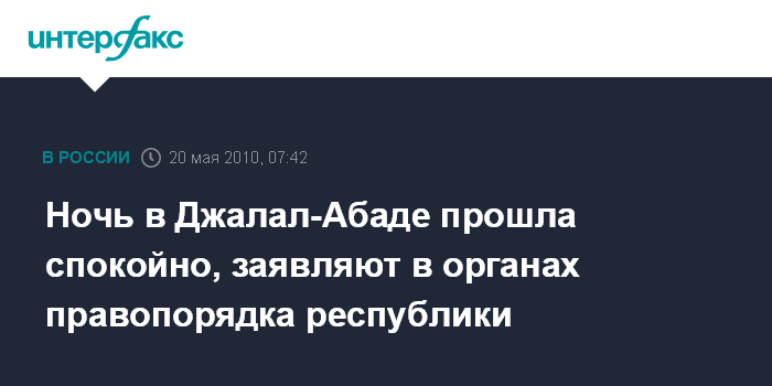 Бишкек. 20 мая. ИНТЕРФАКС - Обстановка в ночь четверга в Джалал-Абаде на юге Киргизии была спокойной, сообщили "Интерфаксу" в правоохранительных органах и жители этого города.