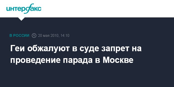 Москва. 20 мая. INTERFAX.RU - Организаторы московского гей-парада намерены обжаловать запрет правительства Москвы на проведение акции в центре столицы и готовы обратиться в Европейский суд по правам человека, сообщил организатор акции Николай Алексеев.