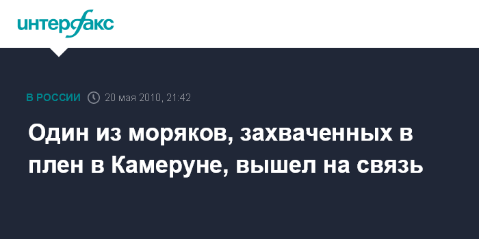 Архангельск. 20 мая. INTERFAX.RU - Капитан судна "North Spirit" Борис Терсинцев, похищенный вместе со старшим механиком Игорем Шумиком пиратами в Камеруне, вышел на связь с судовладельцем, сообщили "Интерфаксу" в Российском профсоюзе моряков.