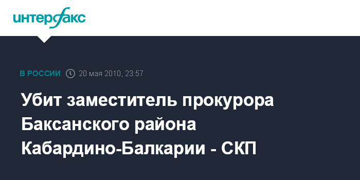 Москва. 20 мая. ИНТЕРФАКС - В Кабардино-Балкарии в четверг вечером убит заместитель прокурора Баксанского района, по данному факту возбуждено уголовное дело.