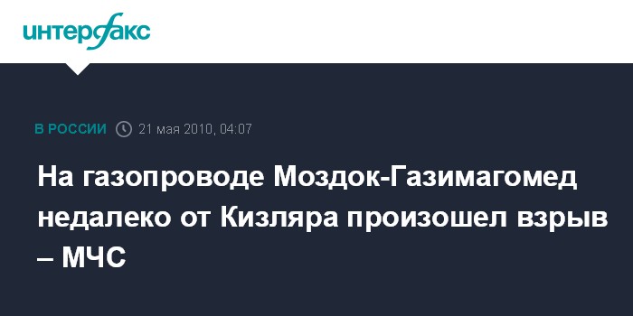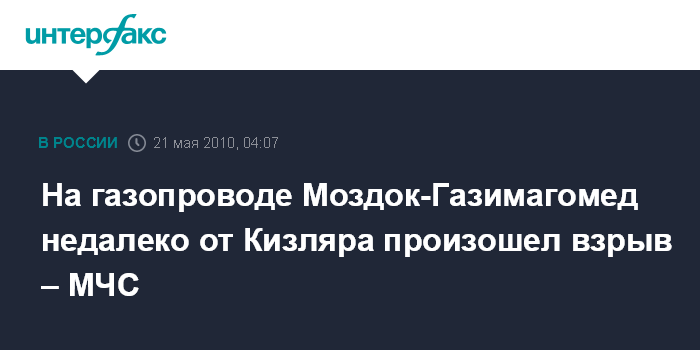 Махачкала. 21 мая. ИНТЕРФАКС-ЮГ - На отводе магистрального газопровода Моздок-Газимагомед недалеко от дагестанского города Кизляр, на границе с Чечней, произошел взрыв, сообщили в пятницу агентству "Интерфакс-Юг", в пресс-службе ГУ МЧС России по Дагестану.