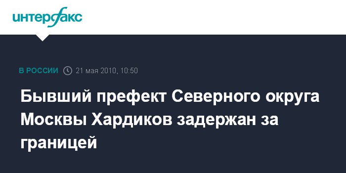 Москва. 21 мая. INTERFAX.RU – Бывший префект Северного округа Москвы Юрий Хардиков, проходящий по уголовному делу о хищении 1 млрд рублей у компании "Интеко", задержан за границей, решается вопрос о его экстрадиции в Россию, сообщили "Интерфаксу" в Следственном комитете при МВД РФ.