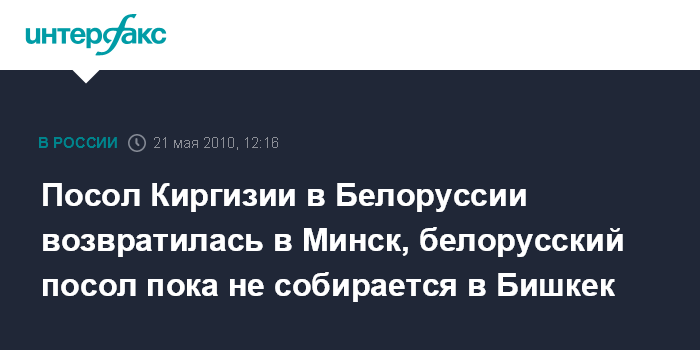 Как заявил агентству пресс-секретарь МИД Белоруссии Андрей Савиных, "в министерстве иностранных дел позитивно восприняли возвращение посла Кыргызстана". "Это, безусловно, хороший канал для диалога, он будет способствовать лучшему взаимопониманию между сторонами", - отметил пресс-секретарь белорусского МИД. При этом он уточнил, что посол Белоруссии в Киргизии Виктор Денисенко по-прежнему находится в Минске.