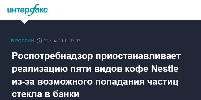 В минувший четверг компания Nestle объявила о добровольном отзыве нескольких наименований кофе в стеклянных банках весом 100 граммов, так как в них могут быть мелкие частицы стекла.