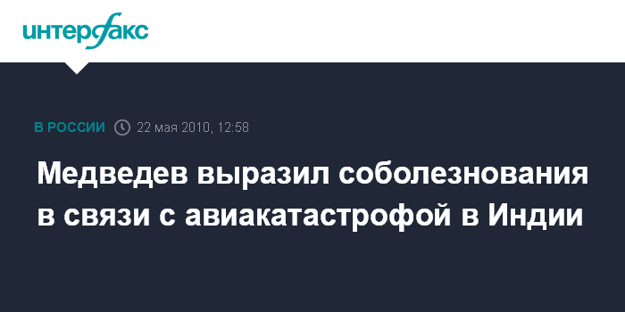 Москва. 22 мая. INTERFAX.RU - Президент России Дмитрий Медведев выразил соболезнования президенту Индии Пратибхе Патил и индийскому премьер-министру Манмохану Сингху в связи с авиакатастрофой в аэропорту города Мангалор, сообщила пресс-служба главы государства в субботу.