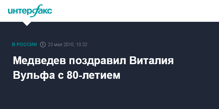 Москва. 23 мая. INTERFAX.RU - Президент России Дмитрий Медведев поздравил с 80-летием искусствоведа, переводчика, заслуженного деятеля искусств РФ, главного редактора Радио "Культура" Виталия Вульфа, сообщает в воскресенье пресс-служба главы государства.